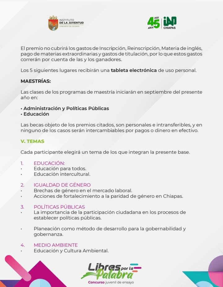 La titular del Instituto de la Juventud y Recreación Faridy Yaraseth Cruz López invitó a los jóvenes tuxtlachiquenses a participar en este concurso y poder expresar sus ideas en temas como: educación, políticas públicas, medio ambiente, entre otros, dijo que los 5 primeros lugares serán acreedores a una beca académica con valor de hasta 120 mil pesos.