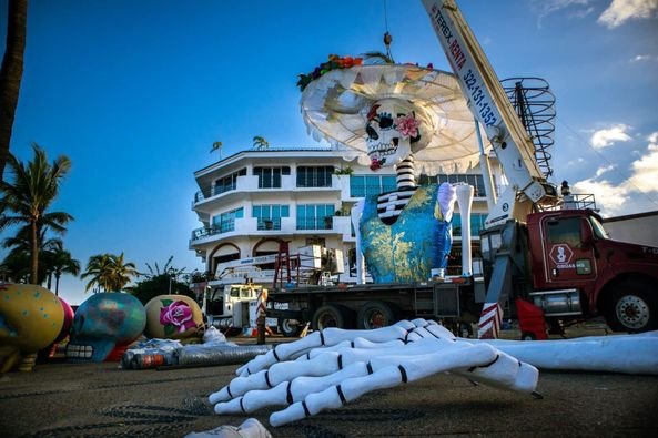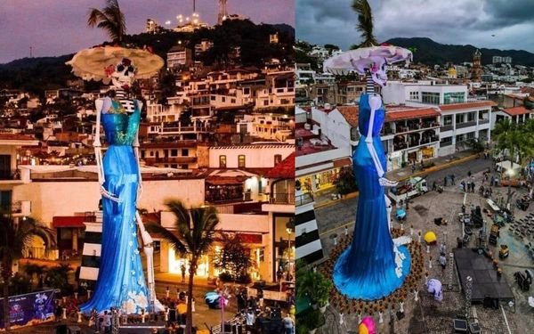 La Catrina luce en el malecón de Puerto Vallarta con motivo de la celebración de Día de Muertos. En Puerto Vallarta, Jalisco, ensamblaron una estructura en forma de Catrina de 23 metros de altura con la que se busca batir el récord Guinness de la catrina más alta del mundo.