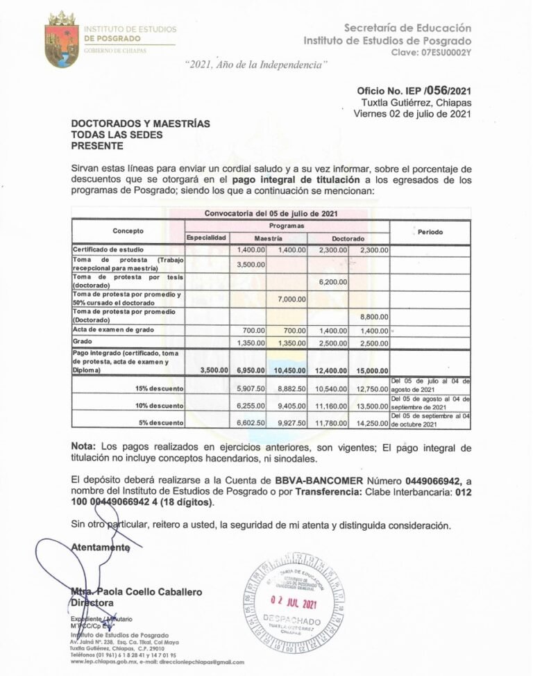 Sin embargo, el uso y manejo de los recursos públicos son conocidos. En ese sentido, de acuerdo a la normatividad gubernamental la Secretaría de Educación es cabeza de sector y de ella dependen organismos públicos como el Instituto de Estudios de Posgrado donde los recursos públicos clasificados como “ingresos propios” que recibe, se depositan en la cuenta de BBVA-Bancomer Número 0449066942, con Clabe interbancaria: 012100 0449066942 4.