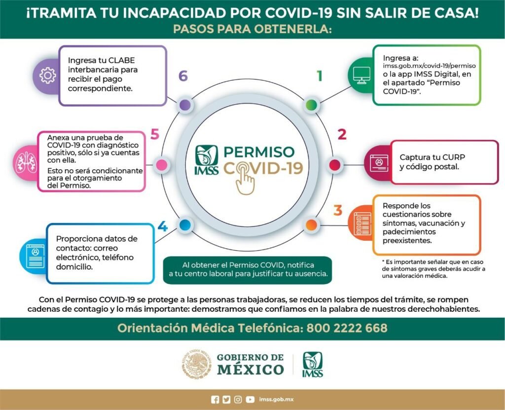 “Si el trabajador necesita orientación telefónica o tiene alguna duda sobre la aplicación se puede marcar al 800 2222 668, opción cero, para recibir asesoría. El Permiso COVID-19 da un subsidio económico correspondiente al 60% de su salario, a partir del cuarto día de incapacidad, y dicha incapacidad está en el rubro de enfermedad general”, mencionó De la Mora.