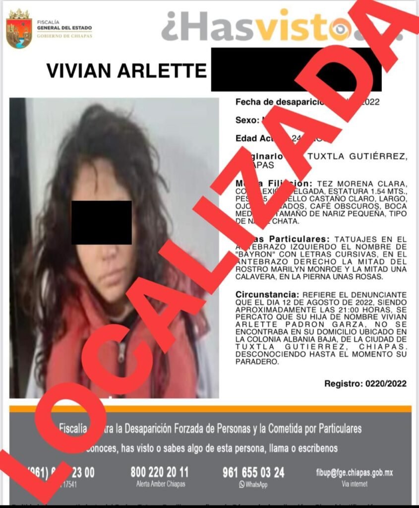 Tuxtla Gutiérrez, Chiapas.- Durante operativos preventivos y disuasivos que se llevan a cabo en todo el estado, elementos de la Secretaría de Seguridad y Protección Ciudadana (SSyPC) localizaron a Vivian “N”, de 24 años, quien tenía reporte de persona no localizada en el municipio de Tuxtla Gutiérrez.