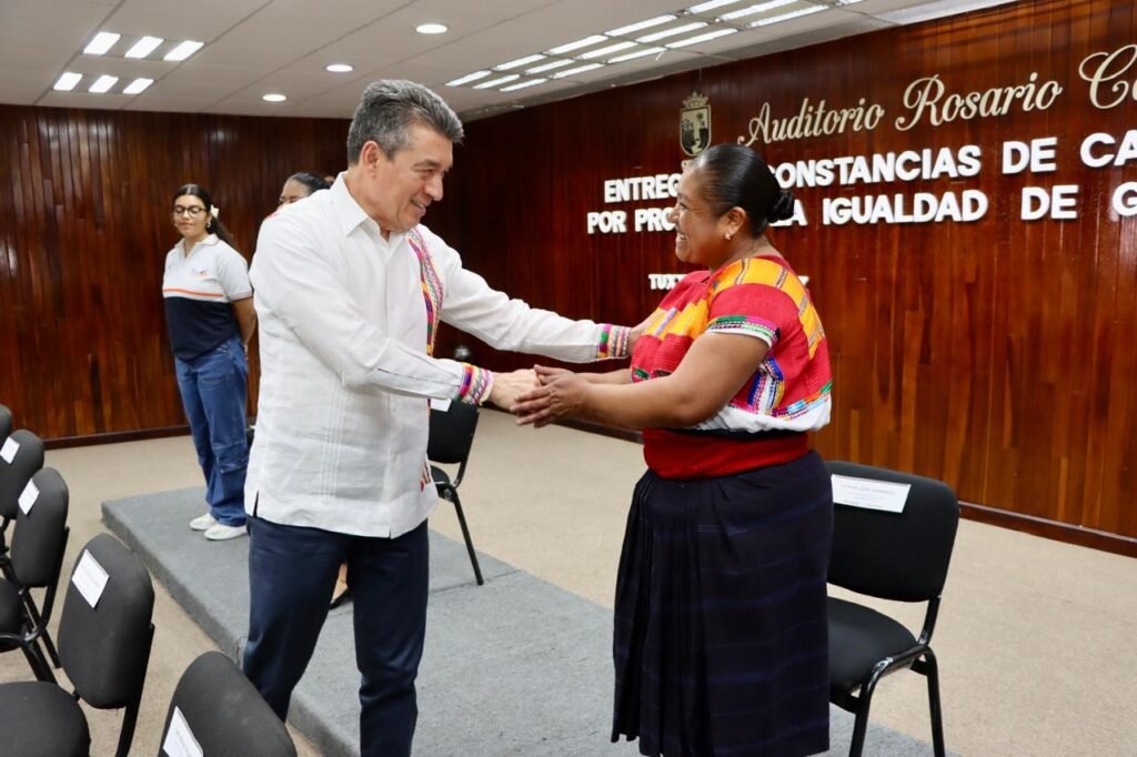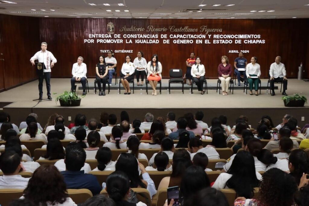 Con el fin de construir un Chiapas más equitativo y garantizar el cumplimiento de los derechos de las mujeres para acceder a mejores oportunidades, el gobernador Rutilio Escandón Cadenas entregó constancias de capacitación y reconocimientos a quienes cursaron las capacitaciones en materia de igualdad de género realizadas por el Instituto de Capacitación y Vinculación Tecnológica del Estado de Chiapas (Icatech).