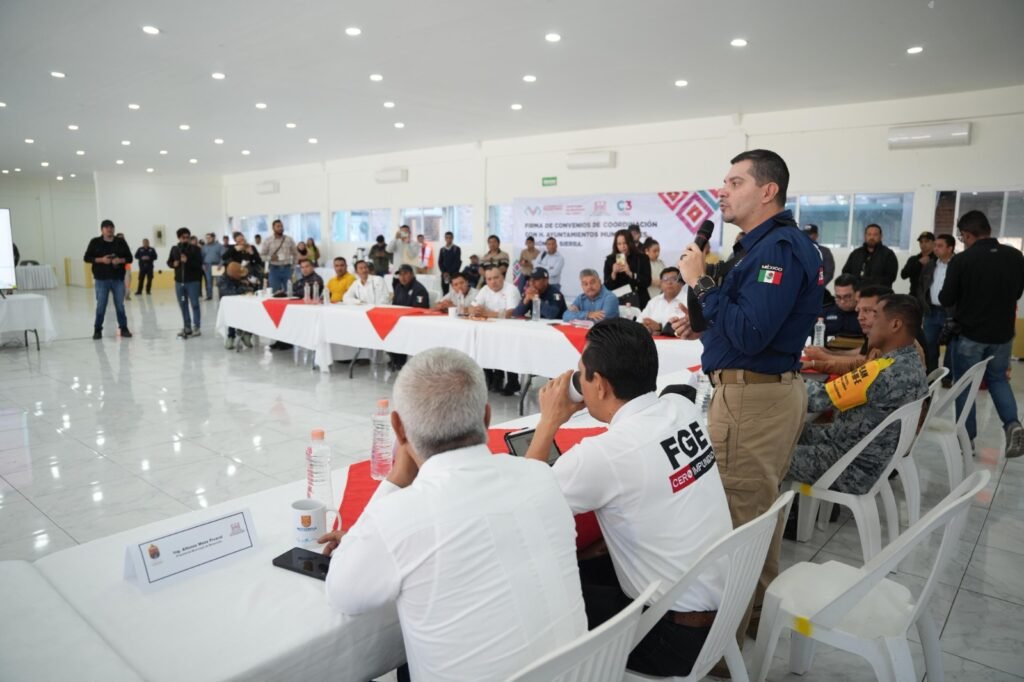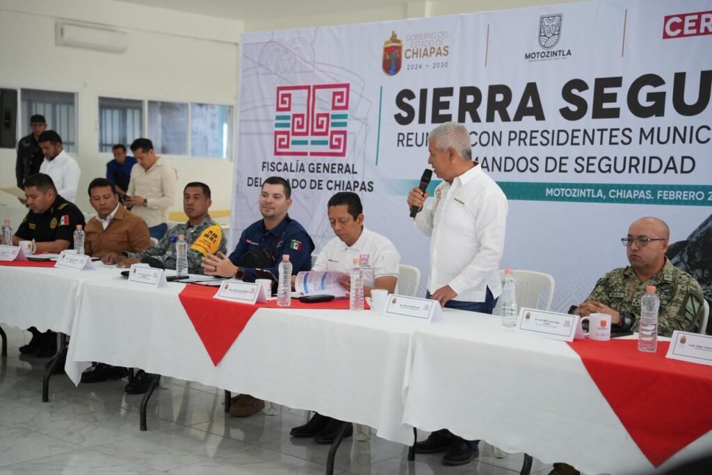 Tuxtla Gutiérrez, Chiapas, 12 de febrero de 2026.- Como parte del fortalecimiento de las estrategias de seguridad que impulsa el gobernador Eduardo Ramírez Aguilar, el secretario de Seguridad del Pueblo, Óscar Alberto Aparicio Avendaño, en compañía del subsecretario de Seguridad del Pueblo, Álvaro Cuauhtémoc Serrano Escobedo, y del fiscal general del Estado, Jorge Luis Llaven Abarca, asistió a la reunión de trabajo “Sierra Segura” con presidentes municipales y mandos de seguridad de esta importante región.