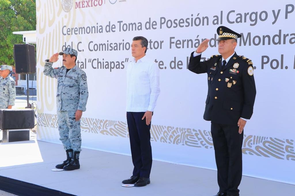 El gobernador Rutilio Escandón Cadenas asistió a la ceremonia de toma de protesta del general brigadier Víctor Fernández Mondragón, como nuevo coordinador estatal de la Guardia Nacional en Chiapas, en sustitución del general Manuel García Morcillo, acto que se realizó en las instalaciones de la Guardia Nacional, en el municipio de Chiapa de Corzo.