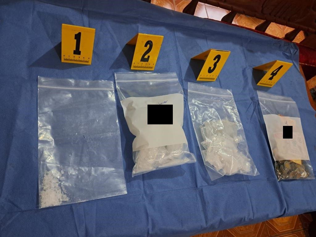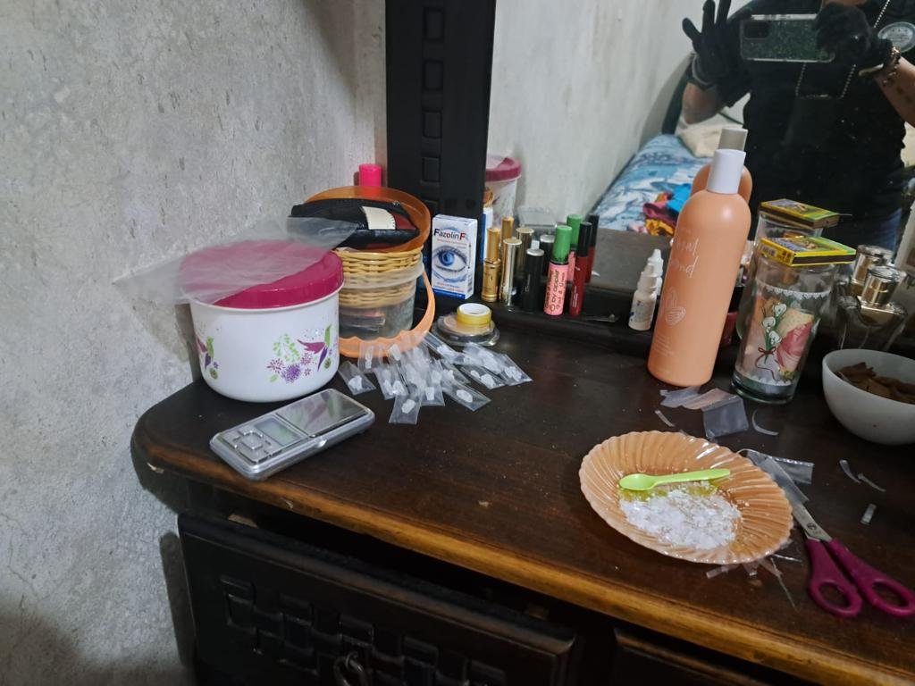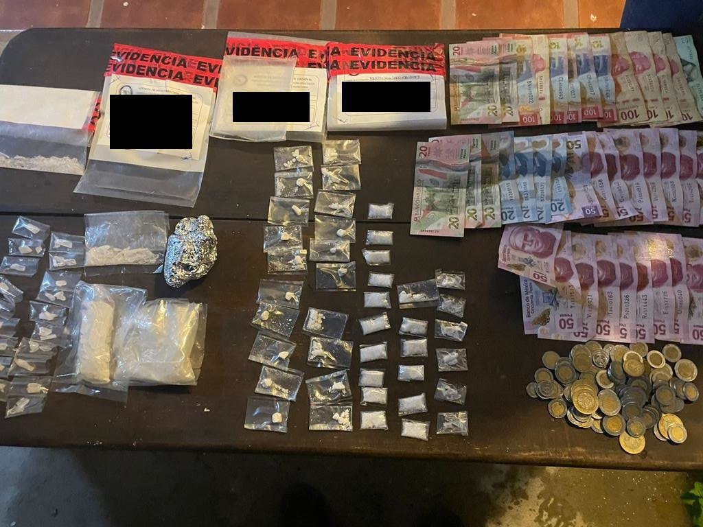 Tras el cateo, a la sentenciada se le aseguraron bolsas de material sintético que contenían en su interior Clorhidrato de Cocaína y Clorhidrato de Metanfetamina, así como dinero en efectivo.