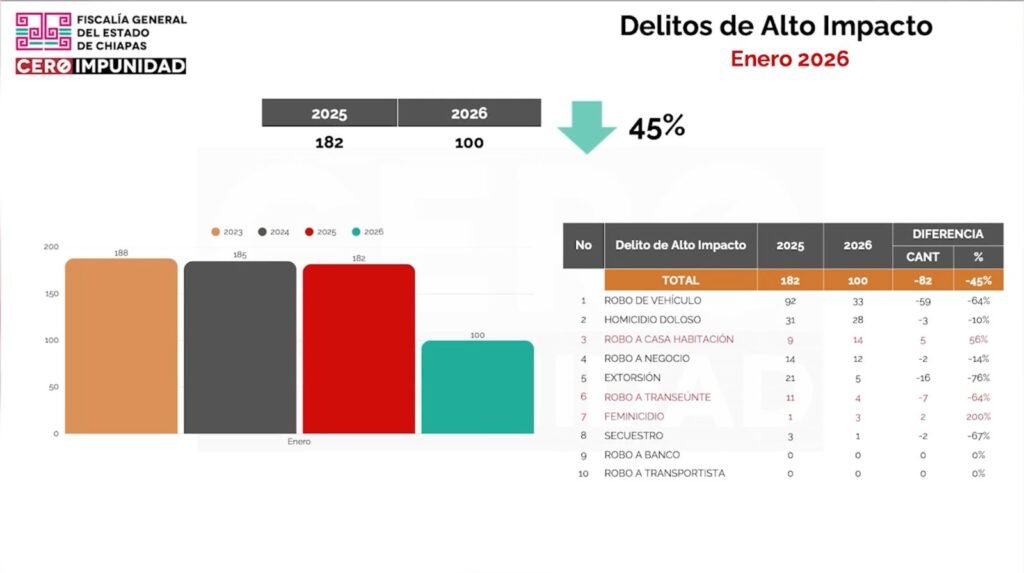 Asimismo reconoció que el delito de feminicidio tuvo un incremento del 200 por ciento, al pasar de un feminicidio en enero de 2025 a tres en enero de 2026. Subrayó que este es un tema que duele y lastima, y aseguró que la FGE mantiene un compromiso de Cero Impunidad, garantizando que todo delito de feminicidio se investigue y se castigue.