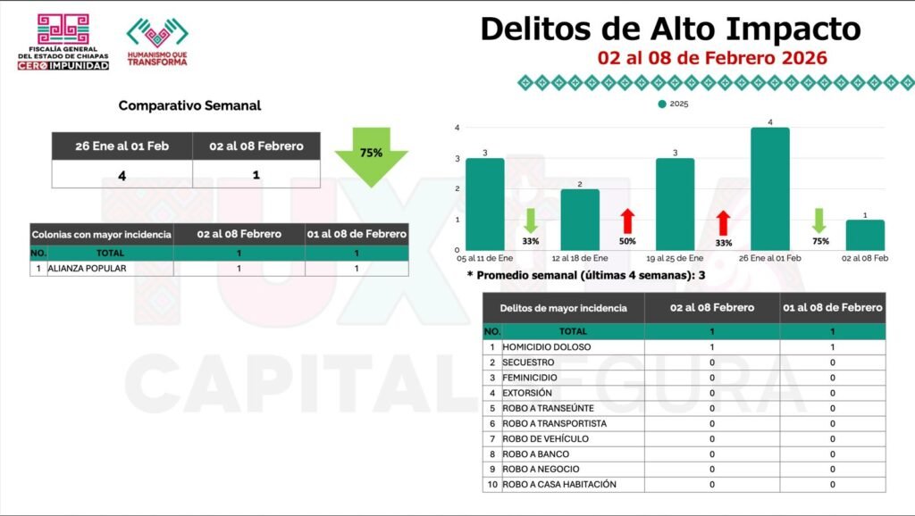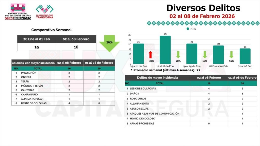 Sobre la incidencia delictiva en la semana del 2 al 8 de febrero en Tuxtla Gutiérrez, Llaven Abarca señaló que en cuanto a diversos delitos se iniciaron 16 denuncias, con un descenso del 16 por ciento, en comparación con la semana antepasada cuando se iniciaron 19. En el caso de delitos de alto impacto hubo un 75 por ciento menos que la semana antepasada, con una carpeta de investigación iniciada por homicidio doloso.