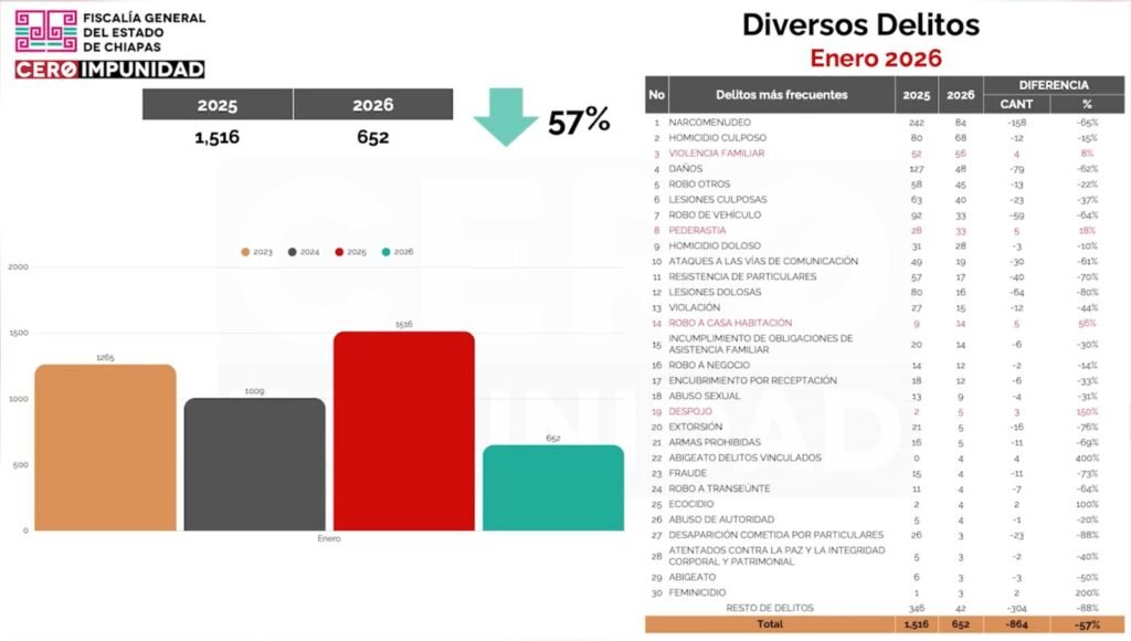 En cuanto a la incidencia delictiva estatal, el Fiscal General dio a conocer un comparativo entre enero de 2025 y enero de 2026. Detalló que, en delitos diversos, en dicho mes en 2025 se iniciaron mil 516 carpetas de investigación, mientras que en 2026 fueron 652, lo que representa un descenso del 57 por ciento.