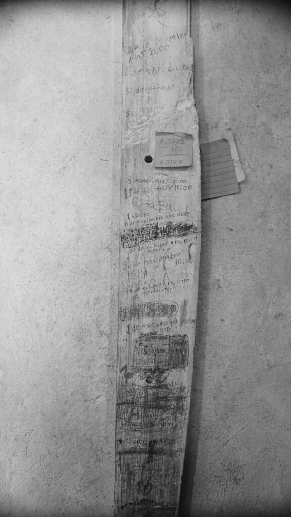 La casa de Petrona queda al fondo de un callejón de más de 300 metros en donde han enterrado baldosas para poder caminar en medio del barro chicloso. La casa queda en la ladera y son dos piezas, la cocina con techo de lamina y lo que sería la sala y una habitación, con dos camas sin colchón, solamente las cobijas que colocan y cuelgan en lasos, suavizan las tablas donde dormía Petrona con sus tres niñas y dos niños, en uno de los costados del marco de la puerta, se observan anotaciones, son cuentas de deudas o cobros.
