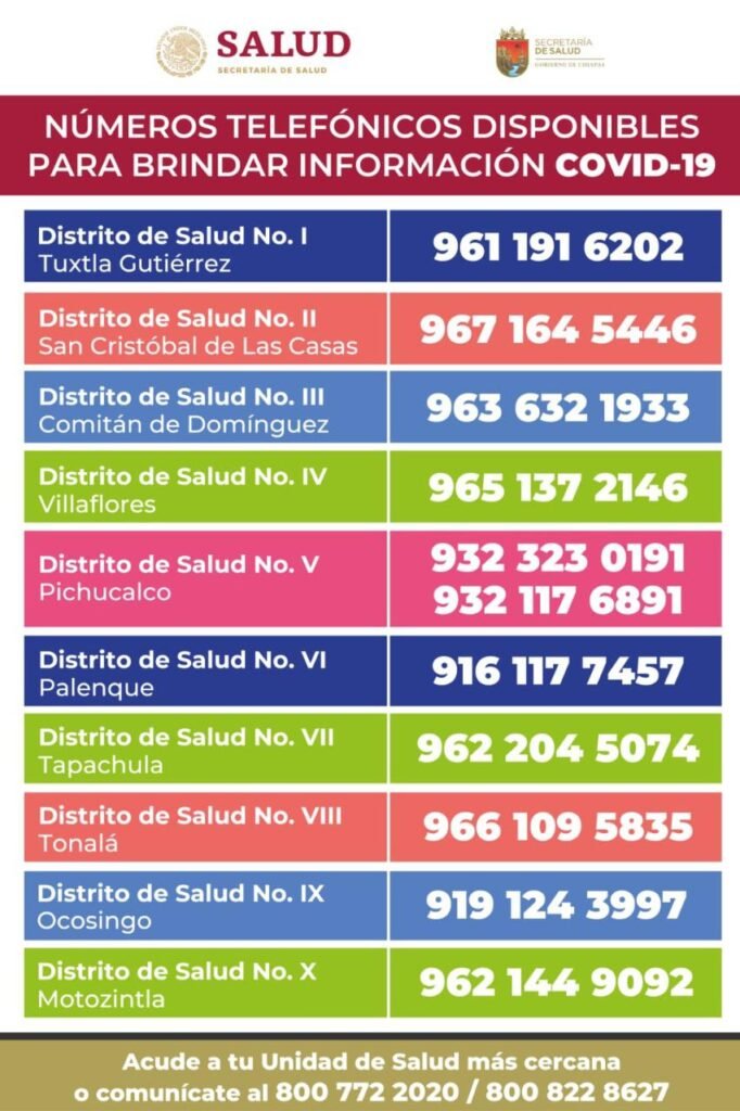 Ante cualquier síntoma respiratorio se debe acudir al médico o notificarlo a las líneas telefónicas COVID 800 772 2020 y 800 822 8627 a nivel estatal; o bien a los números de cada distrito de salud: en Tuxtla Gutiérrez, 961 191 6202; San Cristóbal de Las Casas, 967 164 5446; Comitán, 963 632 1933; Villaflores, 965 137 2146; Pichucalco, 932 323 0191 y 932 117 6891; Palenque, 916 117 7457; Tapachula, 962 255 9736; Tonalá, 966 109 5835; Ocosingo, 919 124 3997; y Motozintla, 962 144 9092.