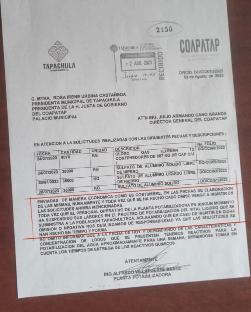“El personal operativo de la planta potabilizadora en ningún momento ha suspendido sus labores en el proceso de potabilización del vital líquido que se suministra a la población tapachulteca”, señala el documento de fecha 02 de agosto.