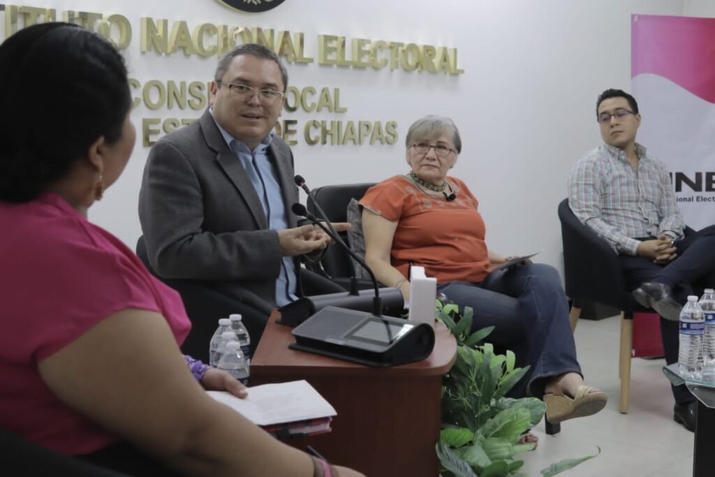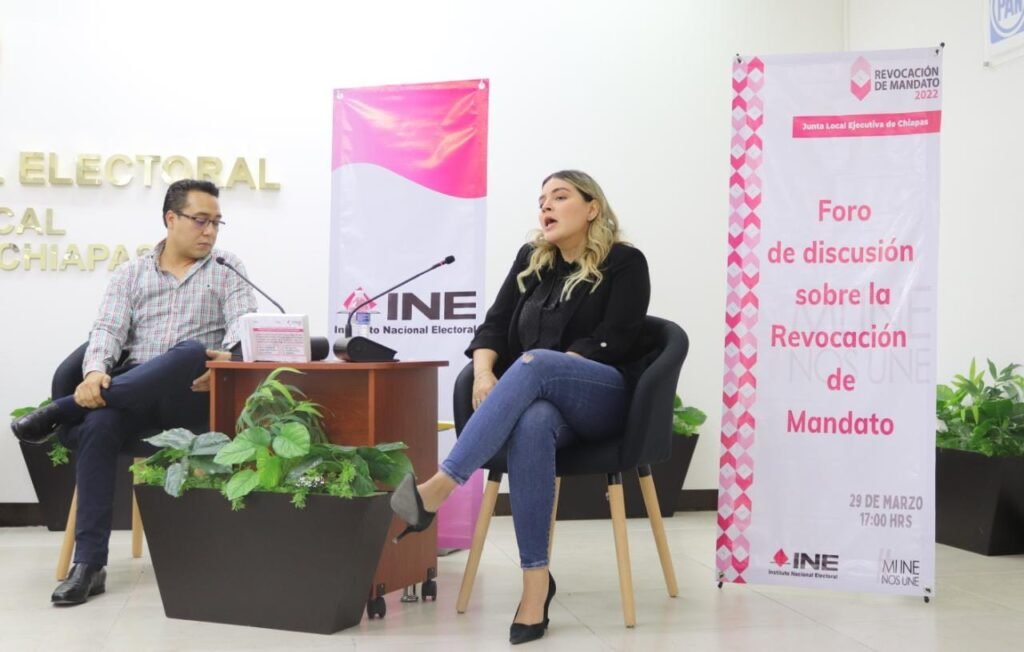 En cumplimiento al mandato constitucional de difundir la Revocación de Mandato, el INE Chiapas, desarrolló el primero de dos foros estatales, transmitido en vivo por las redes sociales institucionales, que logró la interacción del público espectador con el panel de especialistas integrado por el Dr. Oswaldo Chacón Rojas, Consejero Presidente del Instituto de Elecciones y Participación Ciudadana (IEPC); Mtra. Sandra María de los Santos Chandomí, periodista, profesora universitaria y activista; Mtra. Aída Guadalupe Jiménez Sesma, activista social y Exdiputada; y el Dr. Moisés Espinosa Mota, Presidente del Colegio de Abogados Electorales de Chiapas; teniendo como moderadora a la Mtra. Guadalupe Rovelo Camilo, Consejera Electoral del Consejo Local del INE en el estado.