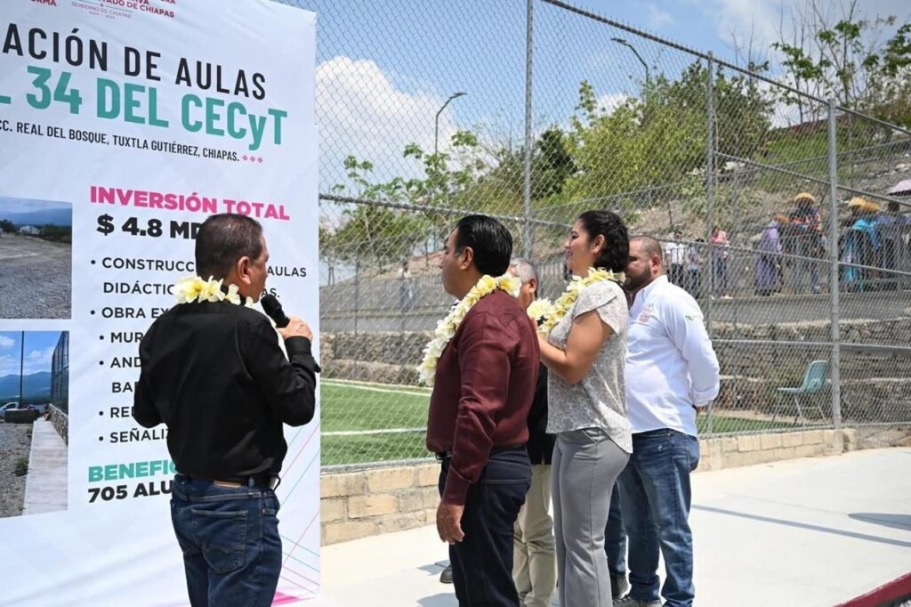 En el Colegio de Estudios Científicos y Tecnológicos del Estado de Chiapas (Cecyt) Plantel 34, ubicado en la colonia Real del Bosque, el mandatario inauguró aulas didácticas y obras exteriores, con una inversión de 4.8 millones de pesos, en beneficio de más de 700 alumnas y alumnos. Señaló que estos esfuerzos continuarán con nuevos proyectos de mejora en la infraestructura educativa de la capital.