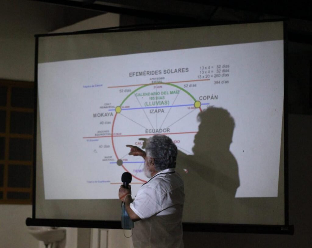 Tuxtla Chico, Chiapas. El iconógrafo, Ajax Moreno Torres impartió la conferencia magistral “Los Nadirs y el Calendario Astronómico de Izapa” en la Casa de la Cultura de Tuxtla Chico. El programa contó con diferentes actividades como un mosaico de bailes folklóricos y la presentación del Frente Izapa con proyecciones alusivas a su escuela y la educación que se imparte en el conocimiento de la cultura Maya.