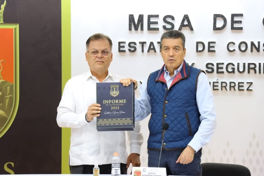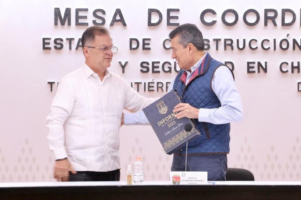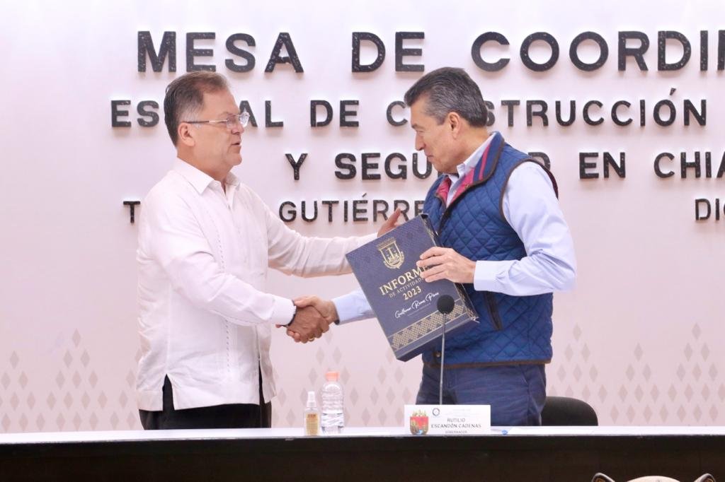 El gobernador Rutilio Escandón Cadenas recibió el informe del estatus que guarda la impartición de justicia en Chiapas, por parte del presidente del Poder Judicial del Estado, Guillermo Ramos Pérez, a quien felicitó y reconoció por el trabajo responsable, comprometido, honesto y transparente que ha establecido a favor de la paz, el bienestar, la justicia y el Estado de Derecho.