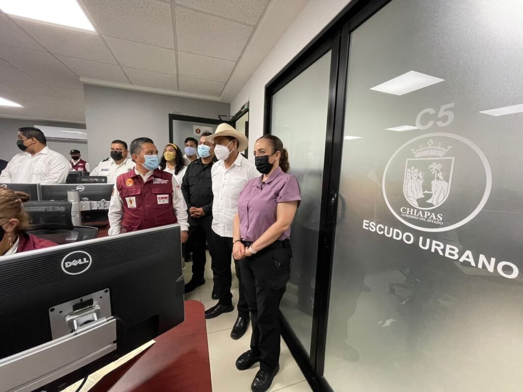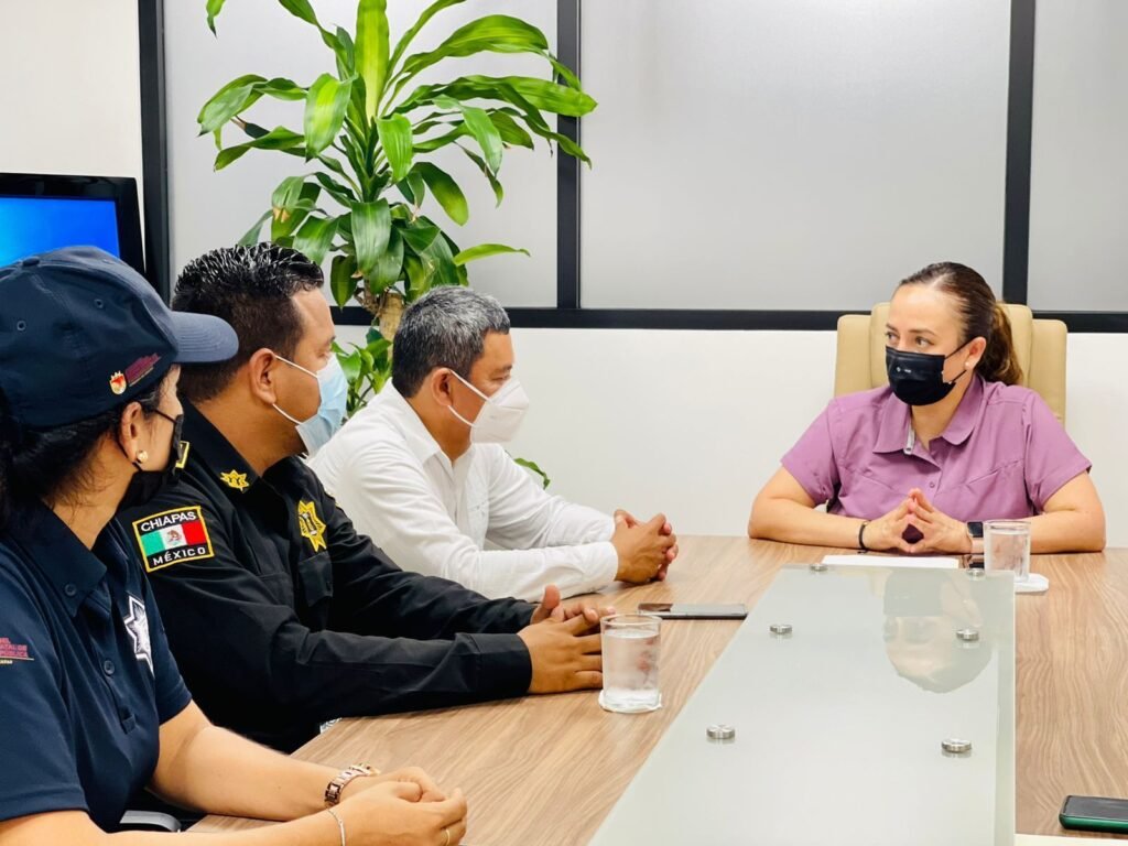 Tuxtla Gutiérrez, Chiapas.- En el marco de una gira de trabajo en la región Costa, en la que además acompañó al gobernador Rutilio Escandón Cadenas a la Entrega de Equipamiento para el Fortalecimiento y la Dignificación de las y los Policías Municipales de Tonalá, la secretaria de Seguridad y Protección Ciudadana, Gabriela Zepeda Soto, sostuvo una reunión de trabajo en Escudo Urbano C5 con el presidente municipal de esta localidad, Natividad de los Santos Miranda, refrendando su compromiso de trabajar en coordinación con los ayuntamientos para continuar garantizando la paz y el orden en Chiapas.