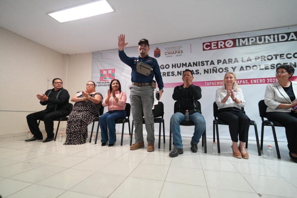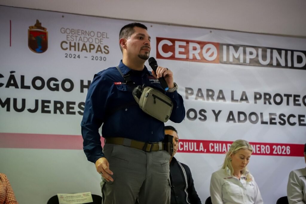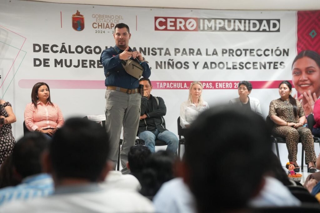 Chiapas; 15 de enero de 2026.- Con el objetivo de fortalecer la seguridad y el bienestar de mujeres, niñas, niños y adolescentes, la Secretaría de Seguridad del Pueblo (SSP), encabezada por Óscar Alberto Aparicio Avendaño, participó en la presentación del Decálogo Humanista para la Protección de Mujeres, Niñas, Niños y Adolescentes, junto al fiscal general del Estado, Jorge Luis Llaven Abarca, así como autoridades estatales, municipales, y representantes de la sociedad civil de los municipios de Pijijiapan y Tapachula.