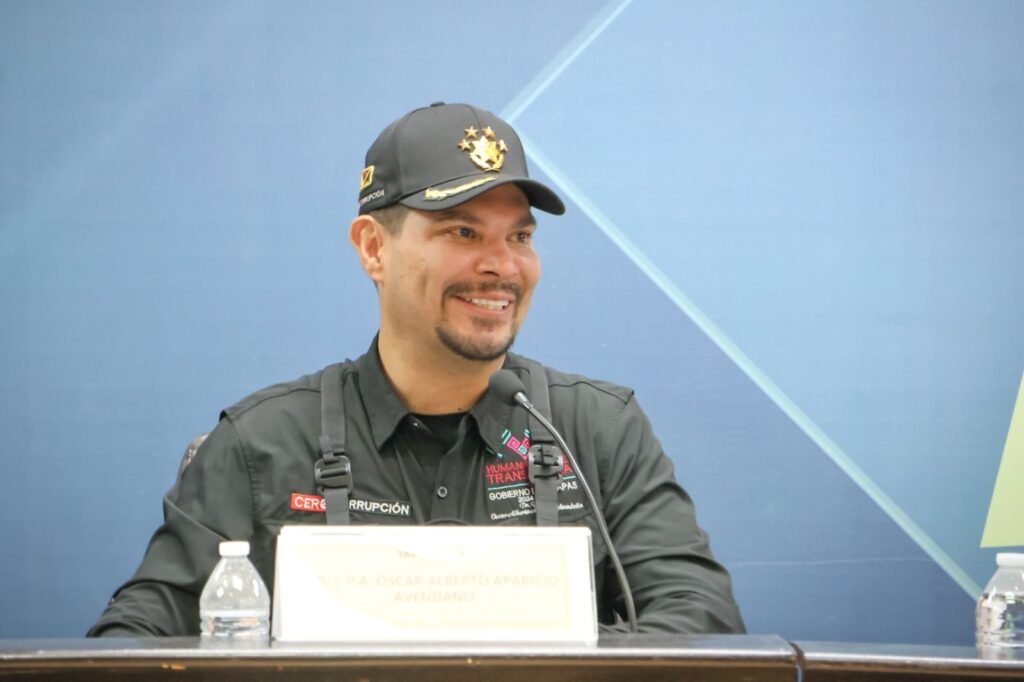 Tapachula, Chiapas; 08 de abril de 2026.- Dando seguimiento a las estrategias del gobernador del estado, Eduardo Ramírez Aguilar, el titular de la Secretaría de Seguridad del Pueblo (SSP), Óscar Alberto Aparicio Avendaño, en compañía del presidente municipal de Tapachula, Aarón Yamil Melgar Bravo y el subsecretario de Seguridad del Pueblo, Álvaro Cuauhtémoc Serrano Escobedo, sostuvieron una reunión de trabajo con locatarios e introductores de productos del mercado San Juan en la Perla del Soconusco.