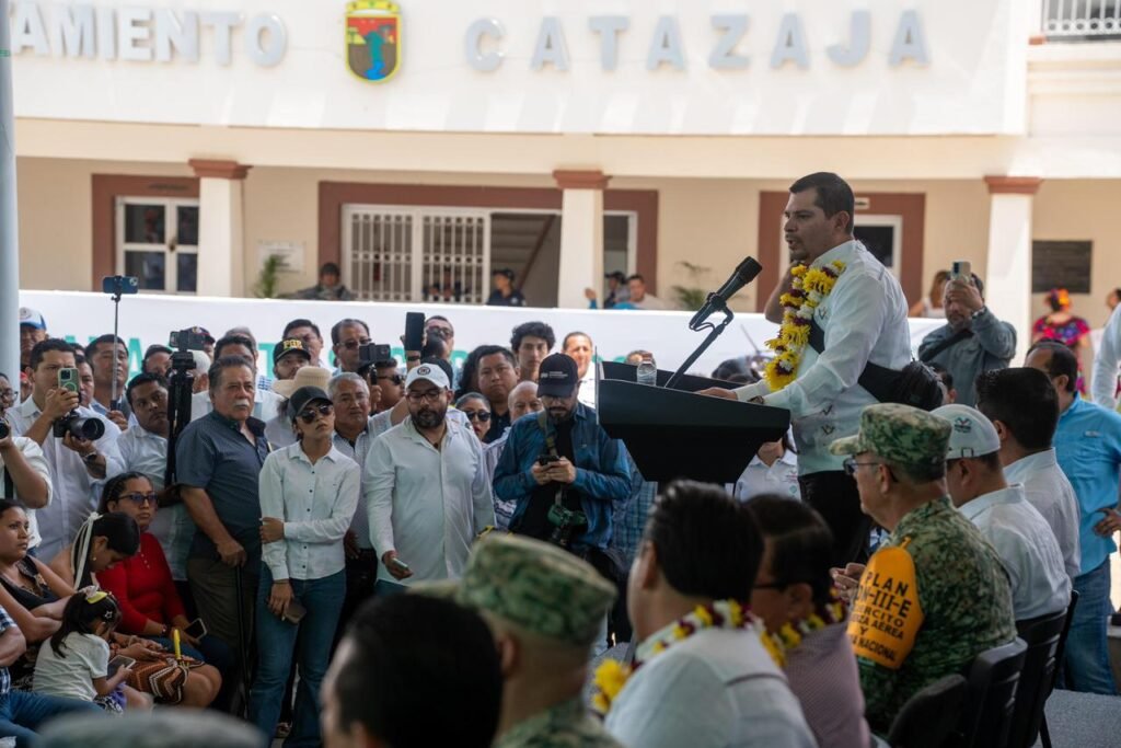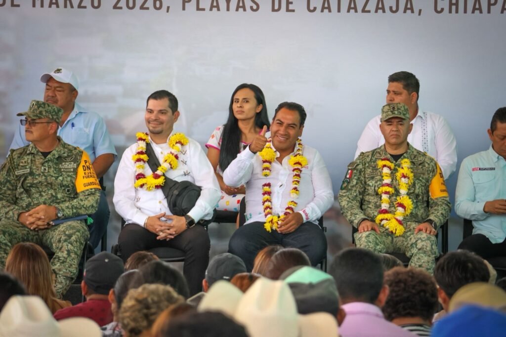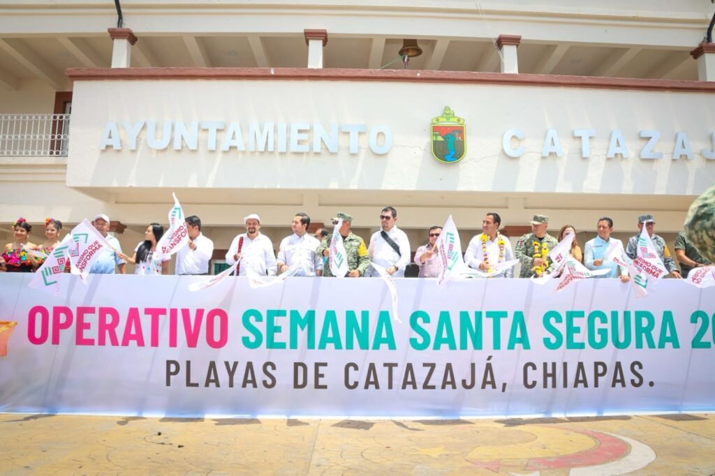 Catazajá, Chiapas; 28 de marzo de 2027.- Con el firme compromiso de garantizar saldo blanco durante la presente temporada vacacional, el gobernador del estado, Eduardo Ramírez Aguilar, junto al secretario de Seguridad del Pueblo, Óscar Alberto Aparicio Avendaño, en coordinación con el presidente municipal de Catazajá, José Luis Damas Ortiz, y en compañía de autoridades de los tres niveles de gobierno, dieron el banderazo de inicio del operativo “Semana Santa Segura 2026” en el municipio de Catazajá.