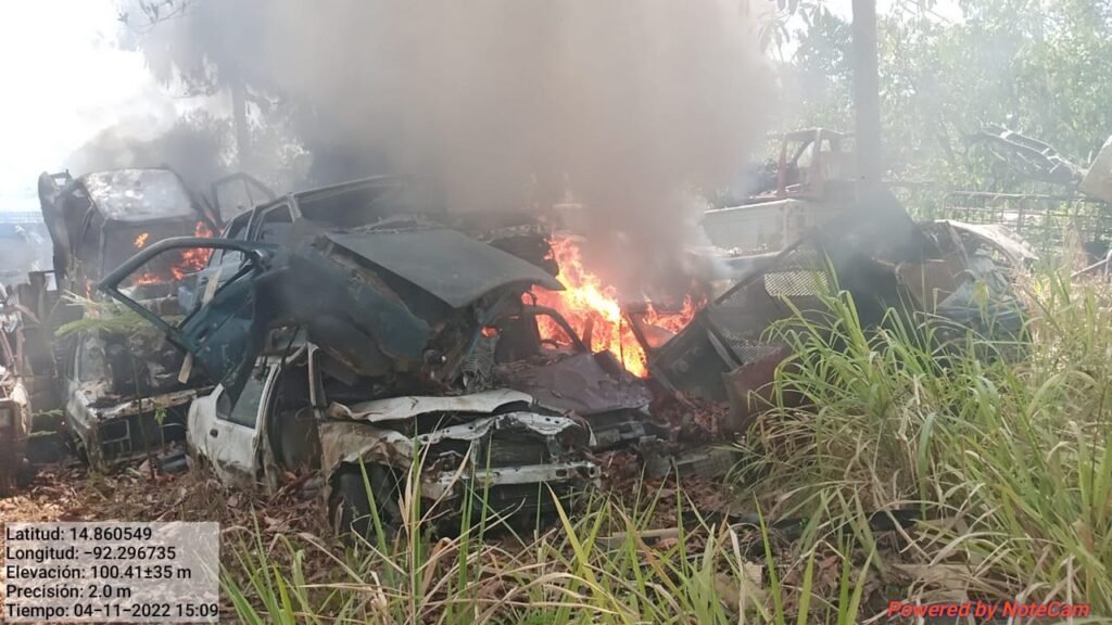 Ante el llamado de emergencia al C5, en donde se establecía que se registraba un incendio en un lote baldío, atrás de la Universidad UDM, en la carretera a Puerto Madero, se procedió a verificar que se trataba del corralón de vehículos siniestrados.