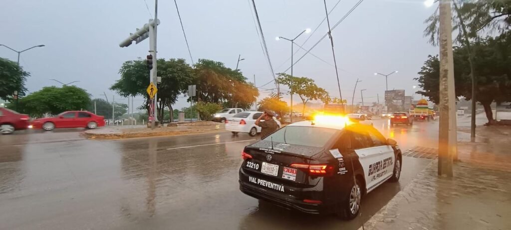 Personal a bordo de unidades oficiales (CRP’s y grúas), así como elementos a pie tierra, se desplegaron en distintos puntos estratégicos de la ciudad, con el objetivo de dirigir el tránsito vehicular, prevenir accidentes y auxiliar a la población afectada por los encharcamientos y deslaves provocados por la lluvia, siguiendo los lineamientos del gobernador del estado, Eduardo Ramírez Aguilar, de proteger a la población ante cualquier eventualidad.