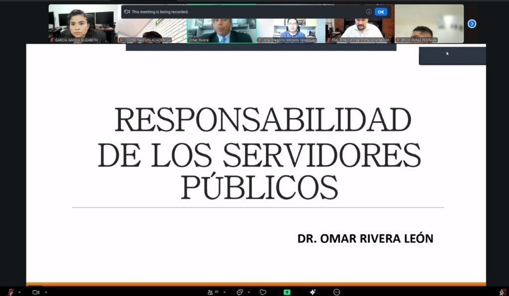La Secretaría de Seguridad del Pueblo (SSP), a través de la Subsecretaría de Inteligencia e Investigación, en coordinación con la Dirección de Profesionalización de la Fiscalía General del Estado (FGE), llevó a cabo en modalidad virtual el curso denominado “Responsabilidad de las Personas Servidoras Públicas”, impartido por el Dr. Omar Rivera León, especialista en la materia.