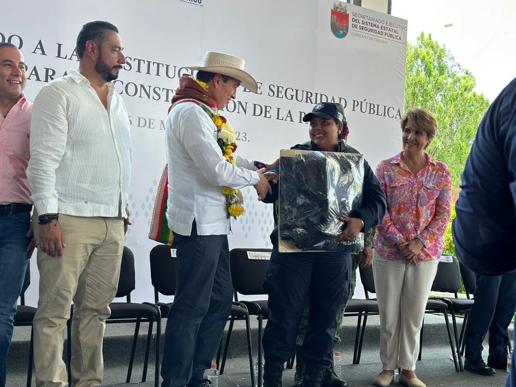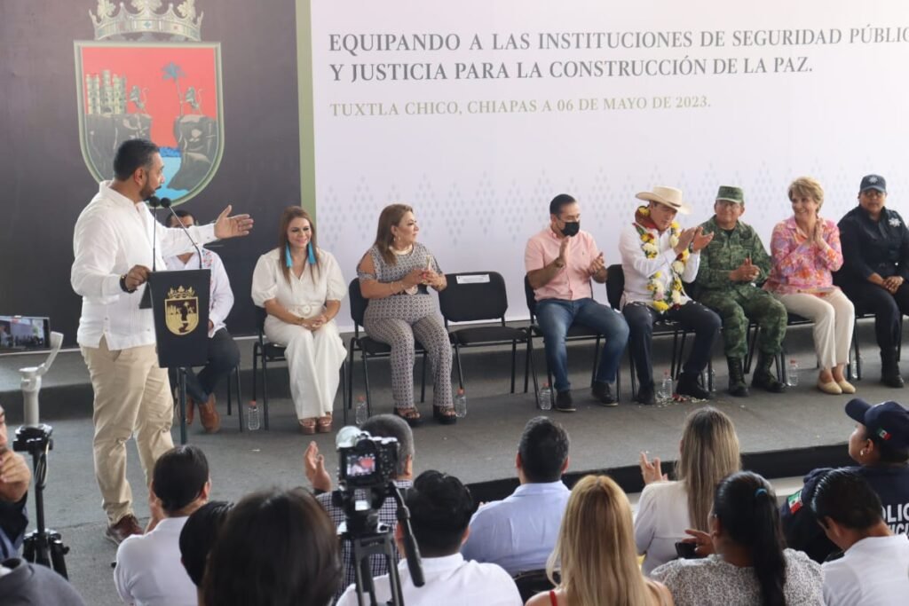 Tuxtla Chico, Chiapas a 08 de mayo de 2023. Gracias a un trabajo cercano y coordinado entre el Gobernador del Estado Rutilio Escandón Cadénas y el Presidente Municipal Julio Enrique Gamboa Altúzar la seguridad y la prevención en el municipio de Tuxtla Chico se refuerza con la entrega de equipamiento tecnológico y dos patrullas a la policía municipal de Tuxtla Chico.