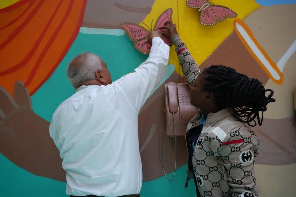 El titular del INM visitó la Estación Migratoria de Las Agujas, ubicada en la Ciudad de México, para encabezar la develación del mural envolvente “Migr-ARTE” y dar el último brochazo a la obra elaborada por personal de la estación y personas migrantes que, con mensajes plasmados en mariposas, llevan a la reflexión de los sentimientos que les invaden al abandonar sus lugares de origen.