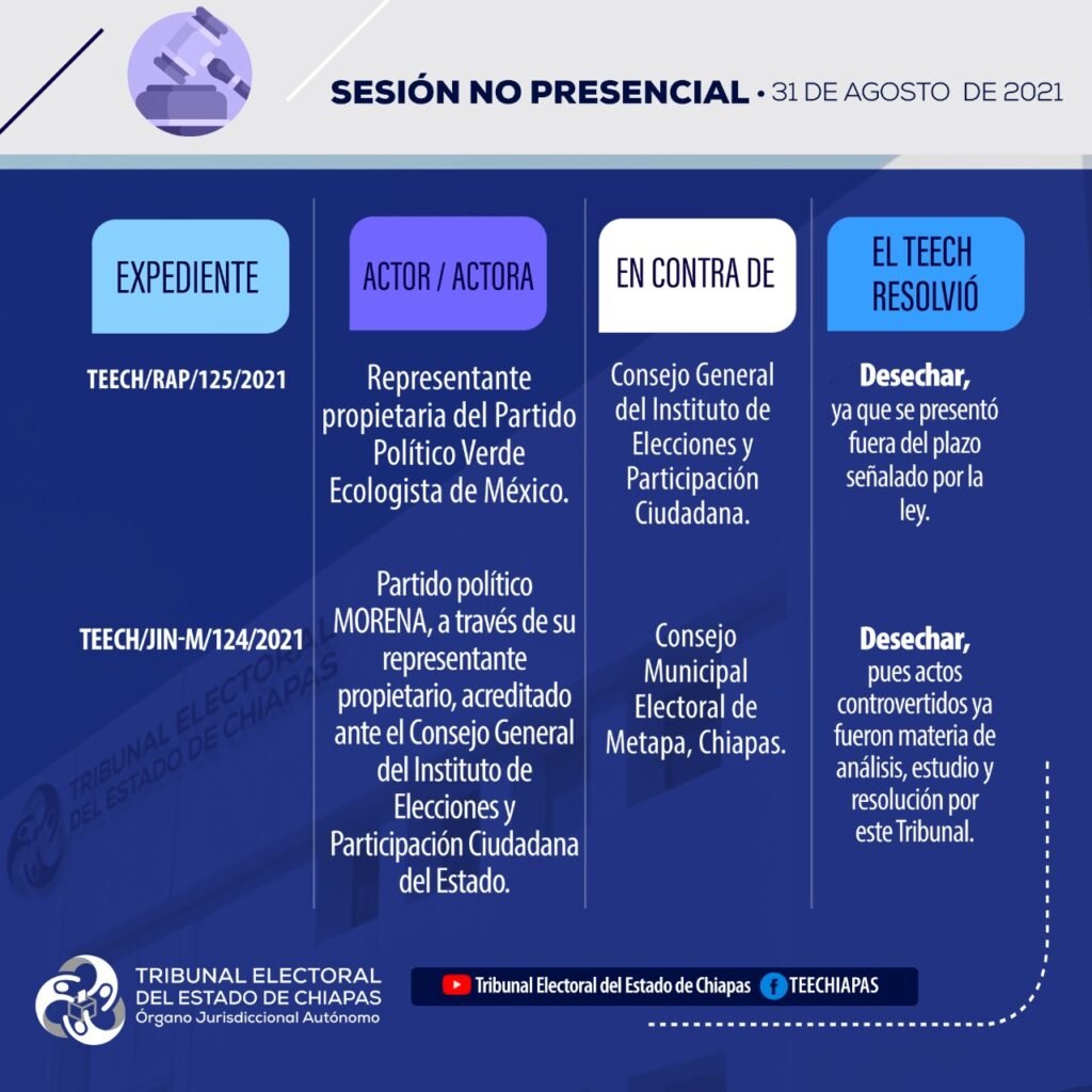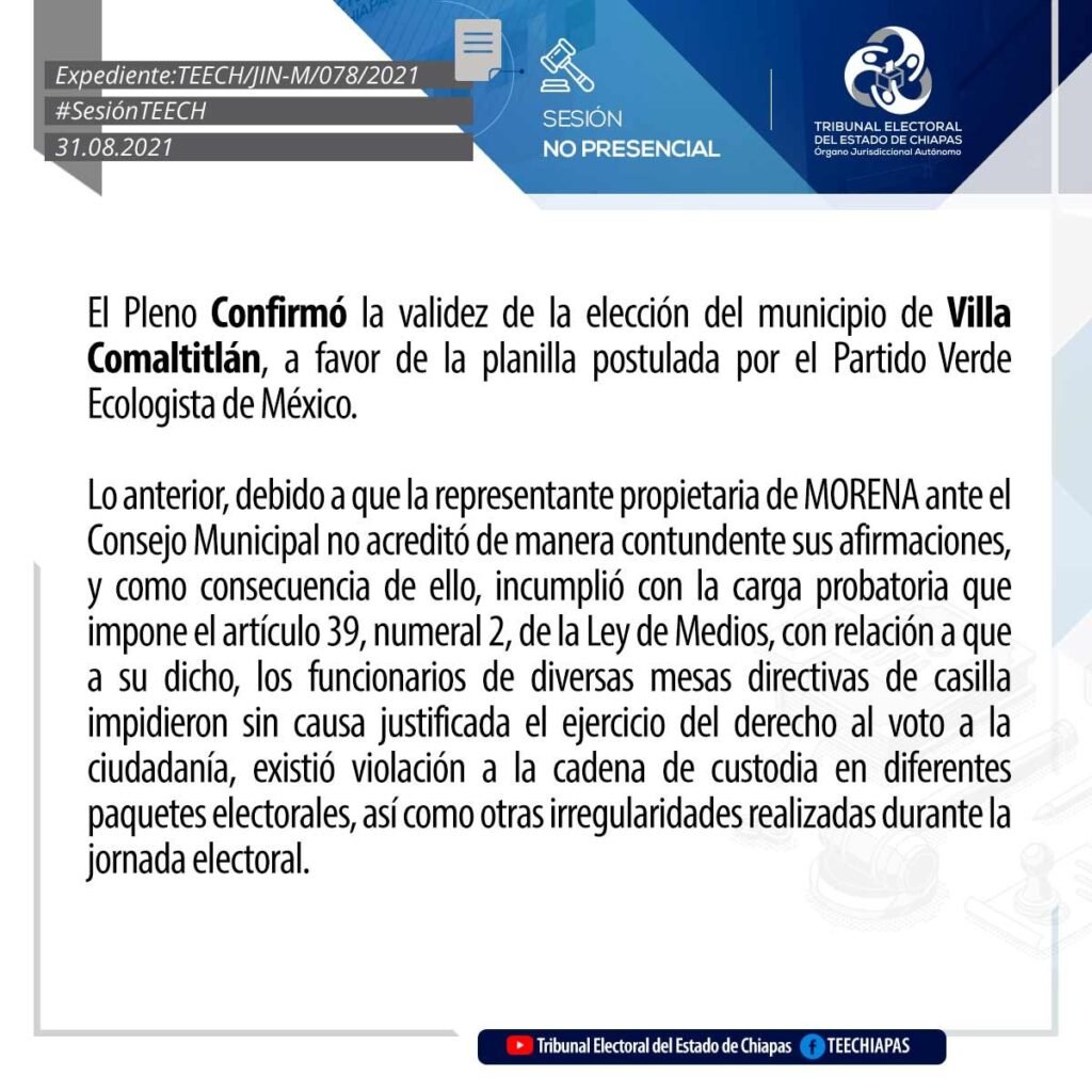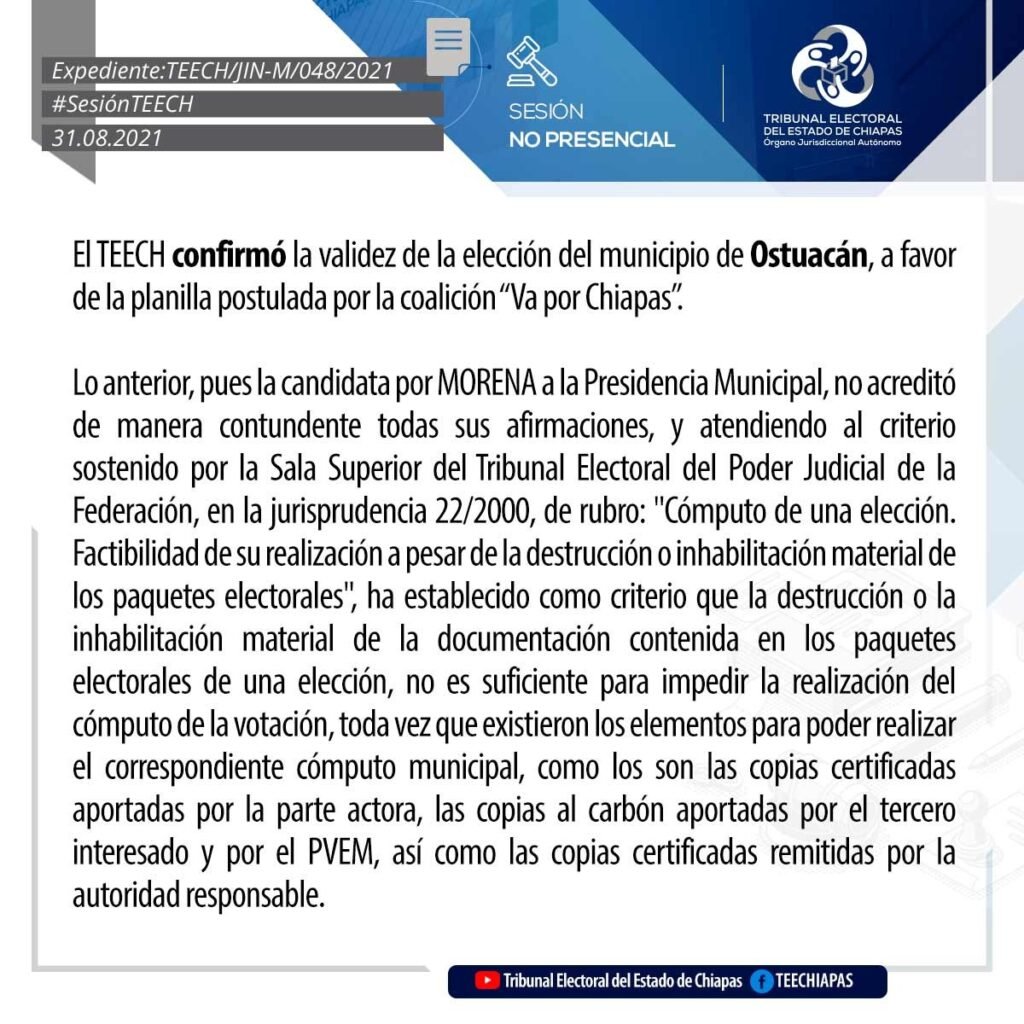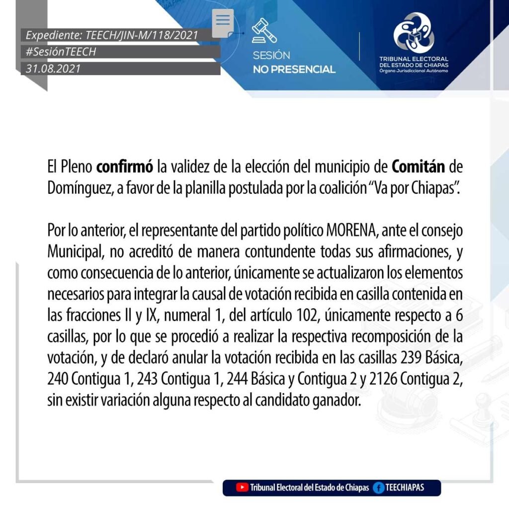 Tuxtla Gutiérrez, Chiapas, 31 de agosto de 2021.- En sesión pública no presencial, mediante videoconferencia, el Pleno del Tribunal Electoral del Estado de Chiapas (TEECH), confirmó por unanimidad de votos, la validez de las elecciones, así como la entrega de constancias de mayoría y validez a las planillas ganadoras de los municipios de Catazajá, Ostuacán, Cintalapa, Villa Comaltitlán, Comitán y Ángel Albino Corzo.