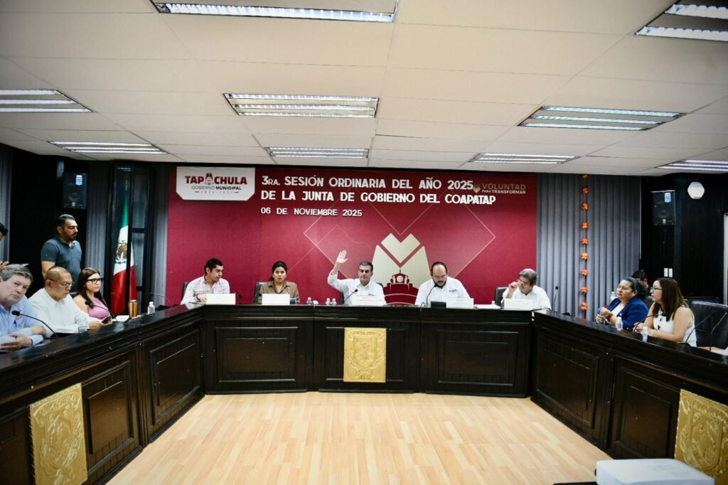 Tapachula, Chiapas; 06 de noviembre de 2025.– El presidente municipal Yamil Melgar Bravo encabezó la Tercera Sesión Ordinaria de la Junta de Gobierno del Comité de Agua Potable y Alcantarillado de Tapachula (COAPATAP), donde se presentaron avances y propuestas orientadas a la modernización administrativa y operativa del organismo.